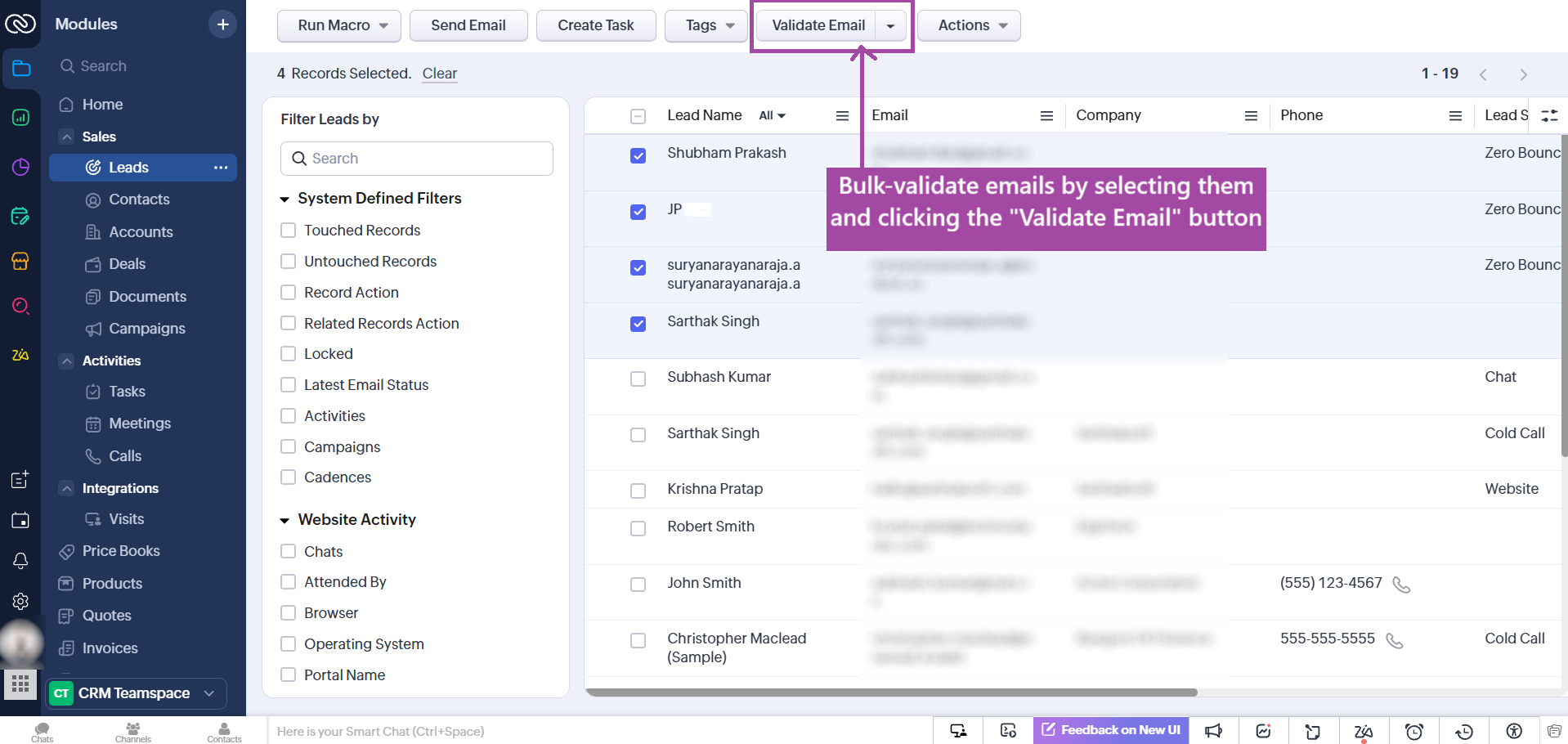 - Go to the List View of the module and select the desired Leads.