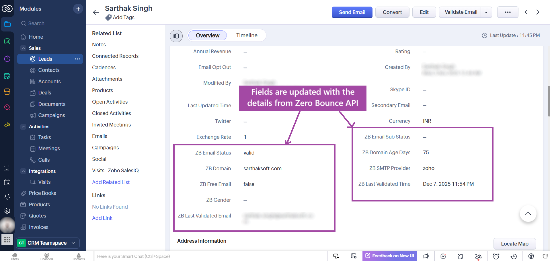 Uninstalling the extension will remove all fields added by the extension along with their validation data. Existing records in your Zoho CRM account will remain intact; only the validation fields and their associated data will be deleted.
