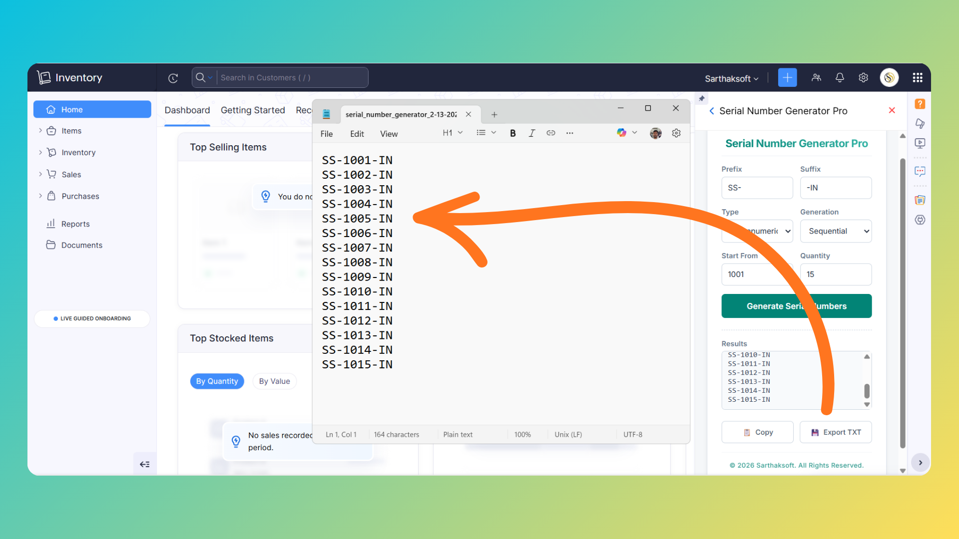 Click Export TXT to download the generated serial numbers as a text file.